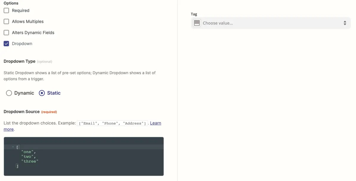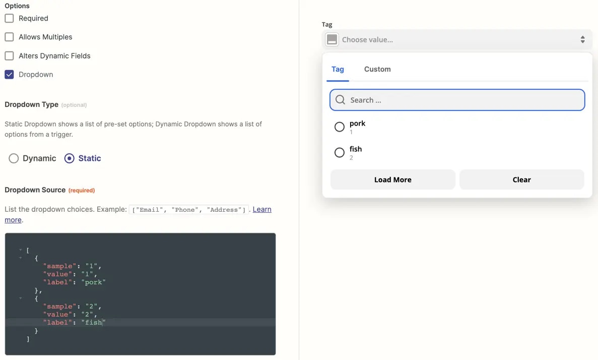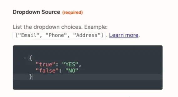 If your API requires different values for the field than the text you want to show to users inside the dropdown menu in Zapier, make a key value pair that includes the value to send to your API, the sample value to show users (should be the same as the value), and a user-friendly label.
