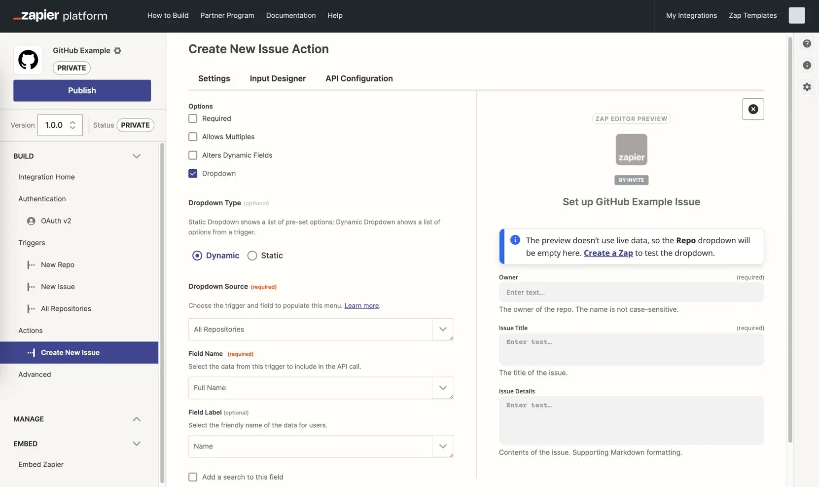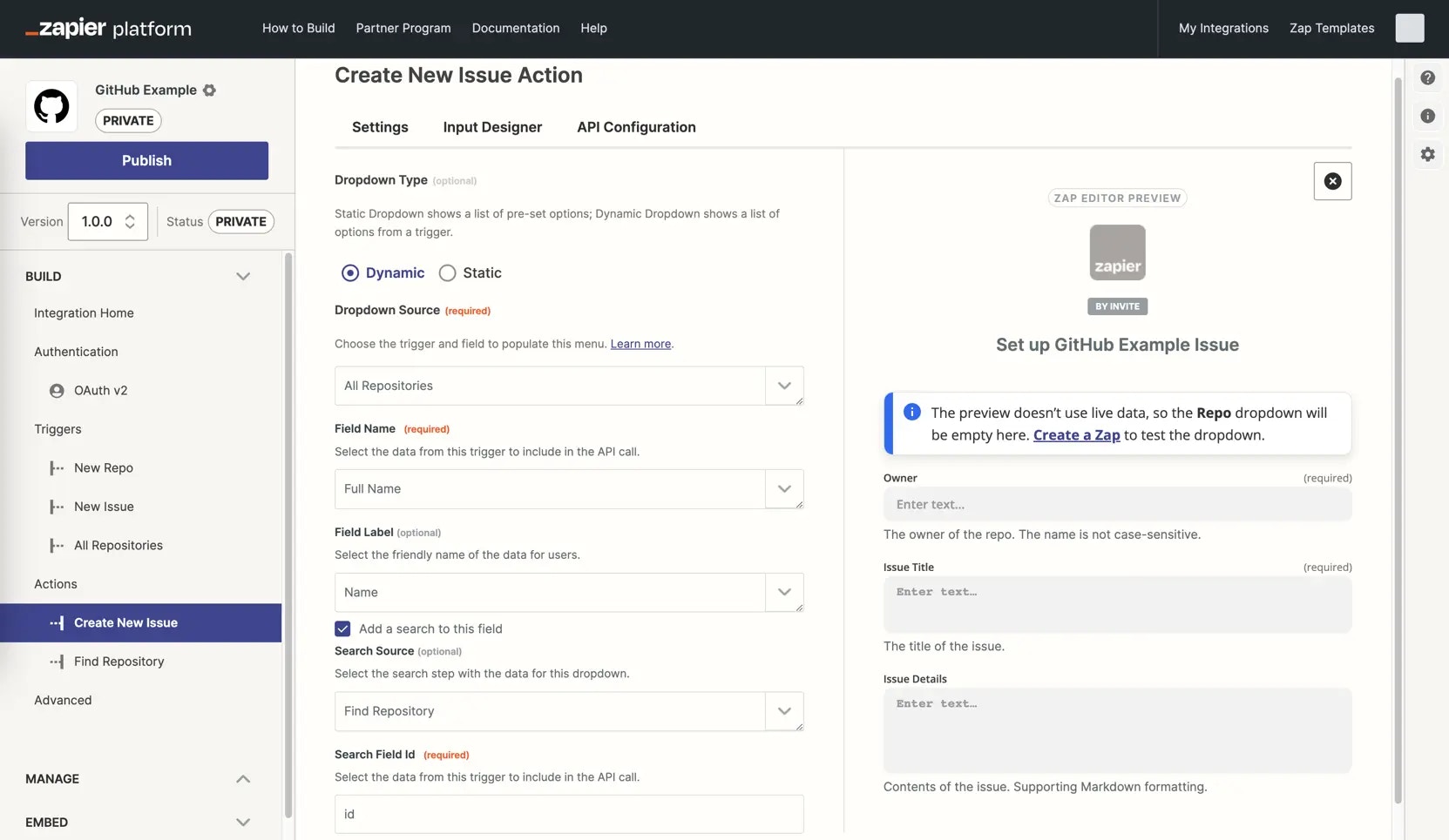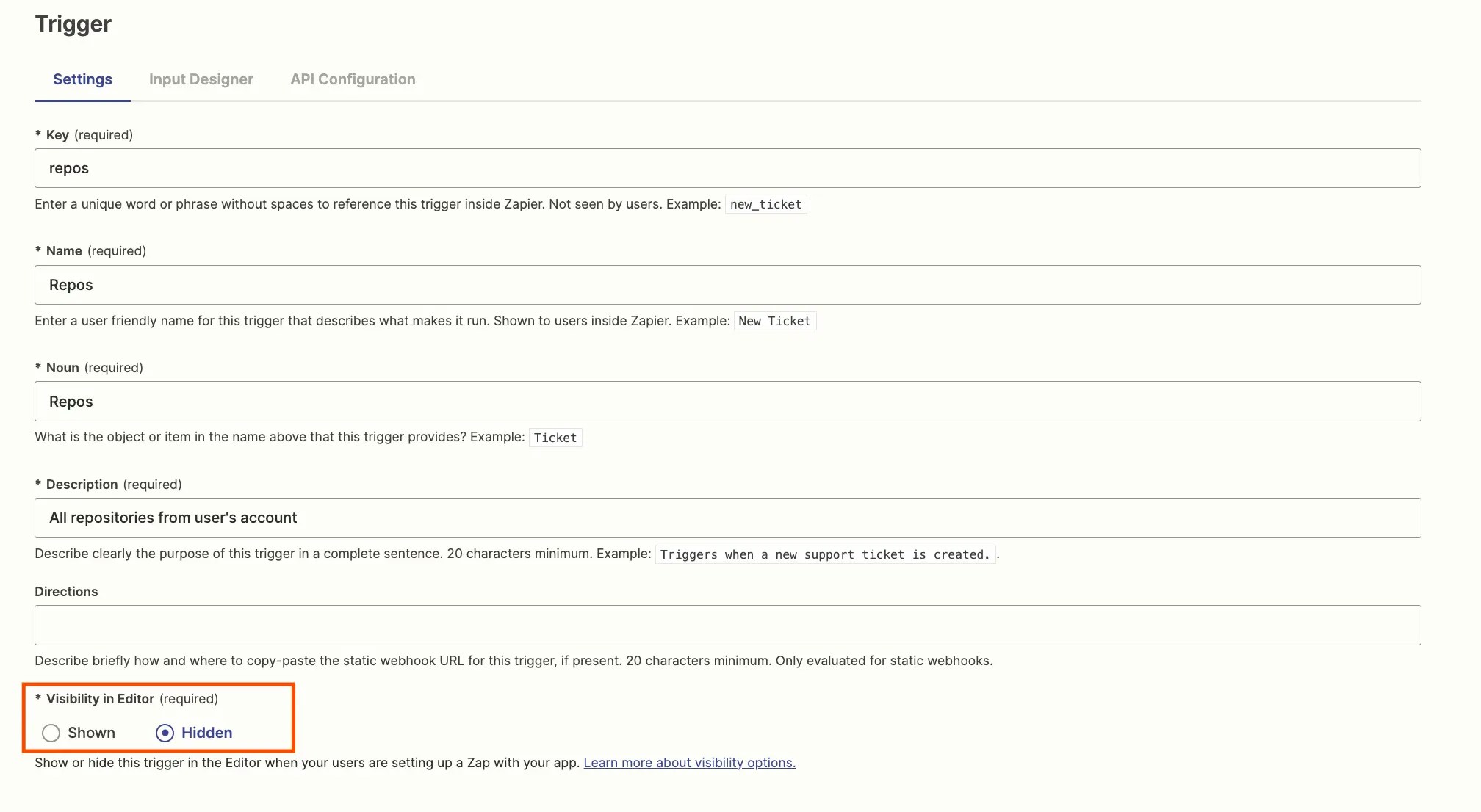 If users need to select data from their account in your app — such as a project, folder, team member, or other user-specific detail with a corresponding ID — then you would use a dynamic dropdown. For dynamic dropdowns, Zapier first fetches data from your API and then displays it in a menu. Never make users type in an ID number, rather use this functionality or add a search action to find the ID number automatically. The best way to make a dynamic dropdown is to use a dedicated trigger to fetch the values for the menu. 1. Build a trigger to fetch dynamic dropdown data Create a new trigger, with a key, name, and noun. This trigger is usually configured to not be seen by users but you may wish to include a description for your internal team’s awareness. In the Visibility in Editor field, selectHidden