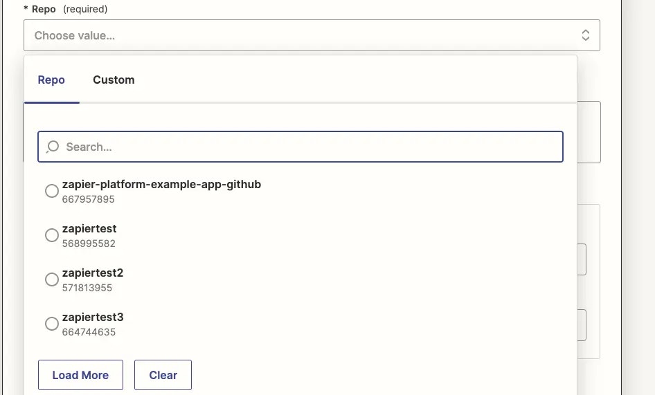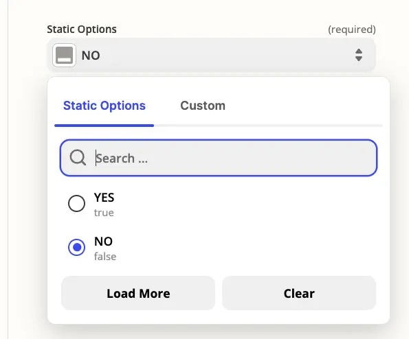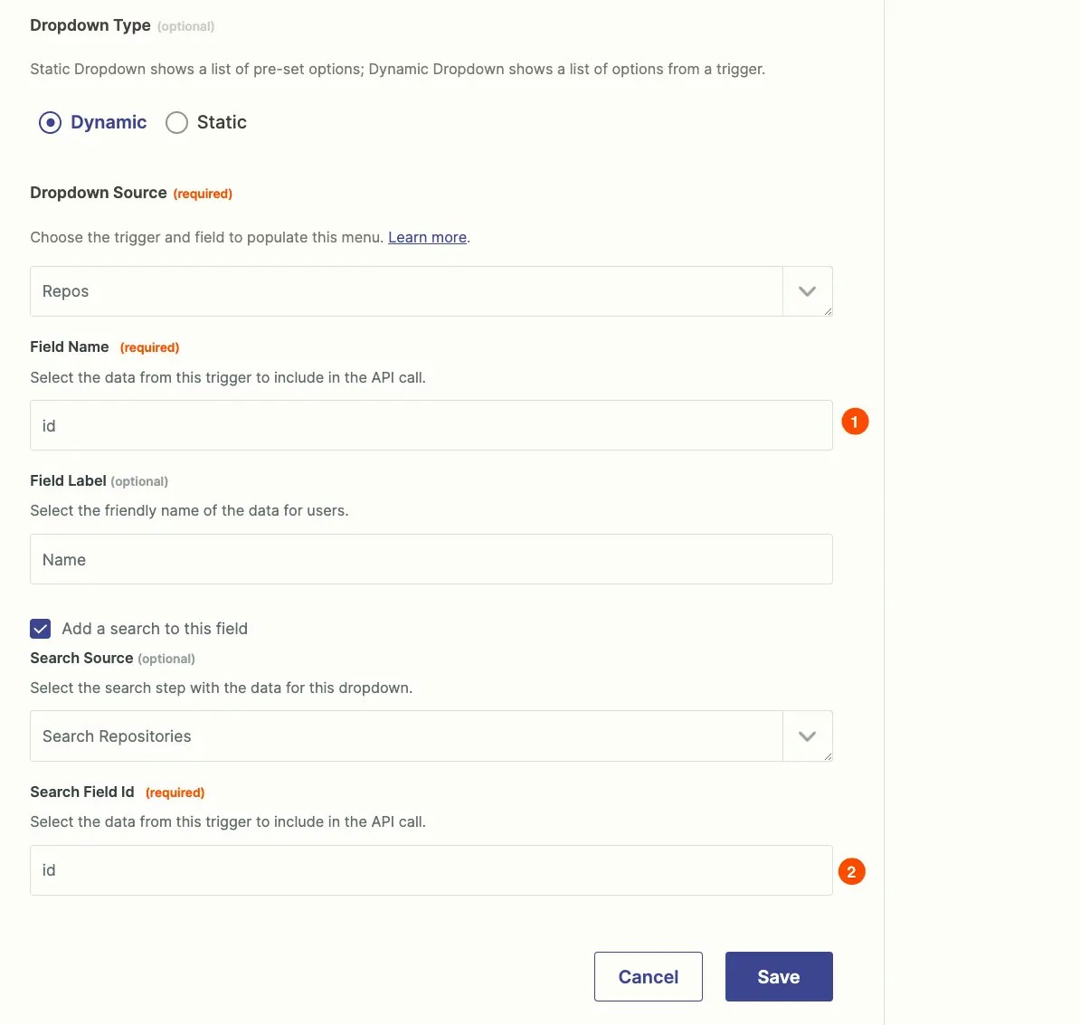 Dynamic Dropdown menus can optionally include an additional Add a Search Step button beside the dropdown menu. This lets users dynamically select the correct item from a dynamic field based on input from previous Zap steps.