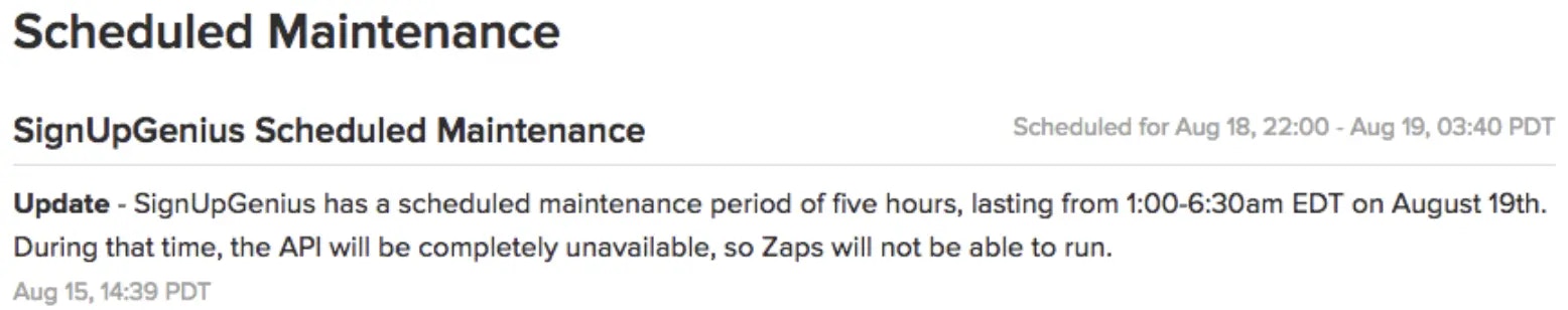 For periods of scheduled maintenance, a status of an app (API) as “unhealthy” can be set between a specific start and end time on request. A “Scheduled Maintenance” message will then be posted to our status page for example.