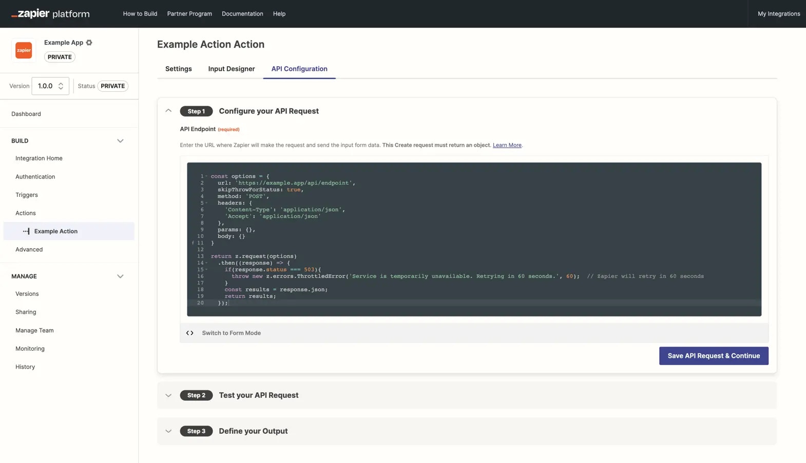 Note: Integrations built with the Zapier Platform UI can enable the skipThrowForStatus toggle under Advanced/Settings to On to use skipThrowForStatus:true